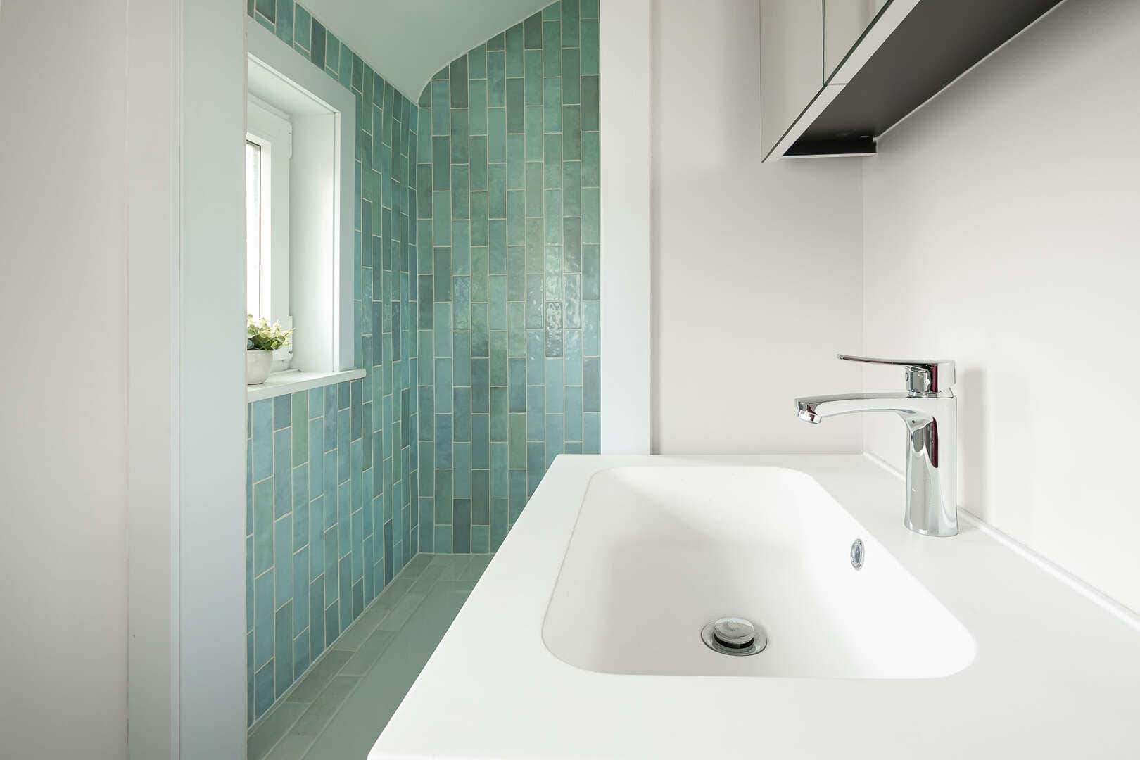 Bathroom with shower, sink, hairdryer and a toilet