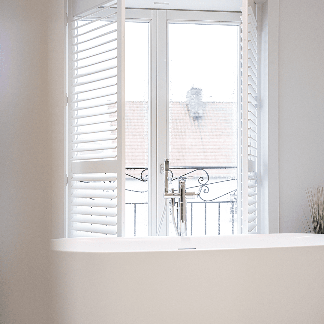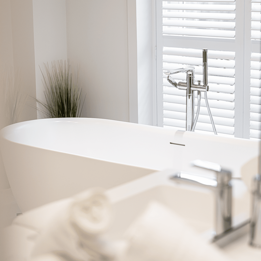 - Badkamer met bad, douche, lavabo, haardroger en een toilet